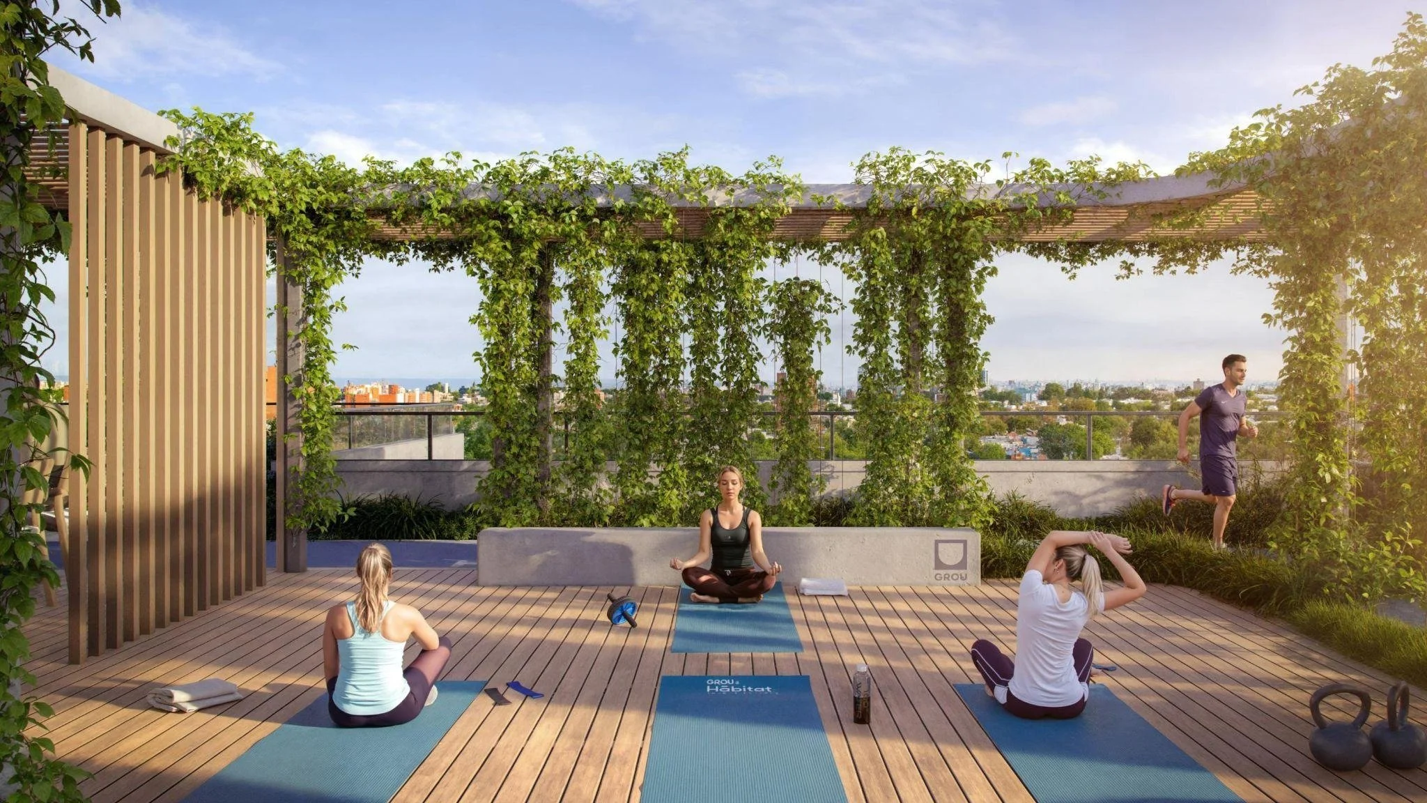 GROU® Hábitat responde a esa demanda con más de 500 m² de amenities: un espacio de cowork para trabajar con infraestructura profesional sin moverse del edificio, área fitness para entrenar a metros de casa, SUM con parrillero para la vida social, y un circuito aeróbico outdoor de 80 metros que integra el movimiento al ritmo cotidiano.